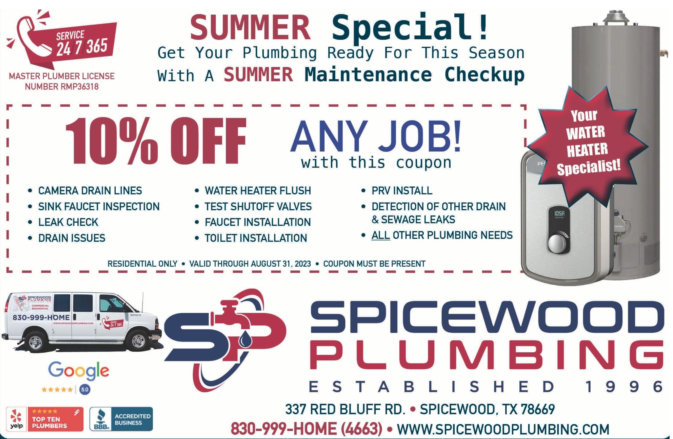 At Spicewood Plumbing, we’re proud to offer expert plumbing solutions with hometown care right here in Spicewood, TX. As your trusted local plumbing team, we go beyond just fixing pipes—we offer value-driven service paired with unbeatable seasonal specials that save you money while protecting your home’s plumbing systems.